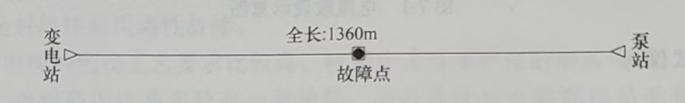 此線路經(jīng)第一次跳閘修復(fù)后相隔10天又發(fā)生跳閘,用兆歐表測量B相對地絕緣電阻為0,在泵站端用萬用表測量B相對地絕緣電阻為500Ω,在變電站測量B相對地絕緣電阻為100Ω,兩次測量值不一樣,分析可能發(fā)生了斷線故障,經(jīng)過連續(xù)性測試確定為B相斷線,于是最后確診該線路發(fā)生了單相開路并接地故障,應(yīng)選用低壓脈沖法測量電纜的故障距離。電纜敷設(shè)情況如圖1-1所示。