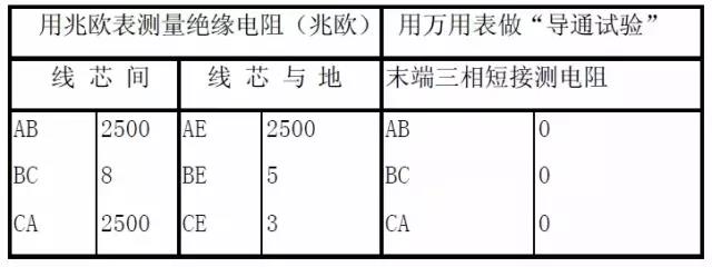 測量絕緣電阻時,使用兆歐表(1千伏以下的電纜,用1000伏的兆歐表;1千伏以上的電纜,用2500伏的兆歐表)來測量電纜線芯之間和線芯對地的絕緣電阻;進行“導通試驗”時,將電纜的末端三相短接,用萬用表在電纜的首端測量芯線之間的電阻?,F(xiàn)將一故障電纜的測量結(jié)果列于表2中,供參考。