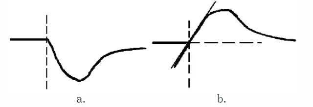 在實(shí)際測(cè)試時(shí),應(yīng)選波形上反射脈沖造成的拐點(diǎn)作為反射脈沖的起始點(diǎn),如圖9a虛線所標(biāo)定處,亦可從反射脈沖前沿作一切線,與波形水平線相交點(diǎn),可作為反射脈沖起始點(diǎn),如圖 9b所示。