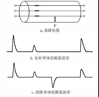實(shí)際測試的電纜結(jié)構(gòu),可能比較復(fù)雜,比如存在分支點(diǎn),脈沖反射波形不容易理解。如圖1.a所示,一中間帶接頭的電纜發(fā)生單相接地故障,首先在良好的芯線上測得一波形,如圖1.b所示,然后在故障芯線上測量波形如圖1.c所示,把二者進(jìn)行比較,在波形上F處二波形明顯出現(xiàn)差異,這是由于故障