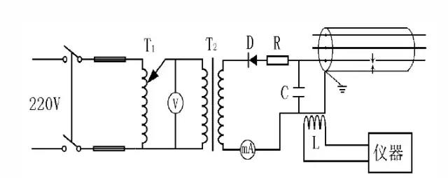 直閃法接線如圖5所示,T1為調(diào)壓器、T2為高壓試驗(yàn)變壓器,容量在1~5千伏安之間,輸出電壓在10~50千伏之間;C為儲(chǔ)能電容器;L為線電流取樣耦合器。電流取樣耦合器L的輸出經(jīng)屏蔽電纜接測(cè)距儀器(閃測(cè)儀)的輸入端子。注意:一般感應(yīng)式電流取樣耦合器L的正面標(biāo)有放置方向,應(yīng)將電流耦合器按標(biāo)示的方向放置,否則,輸出的波形極性會(huì)不正確。