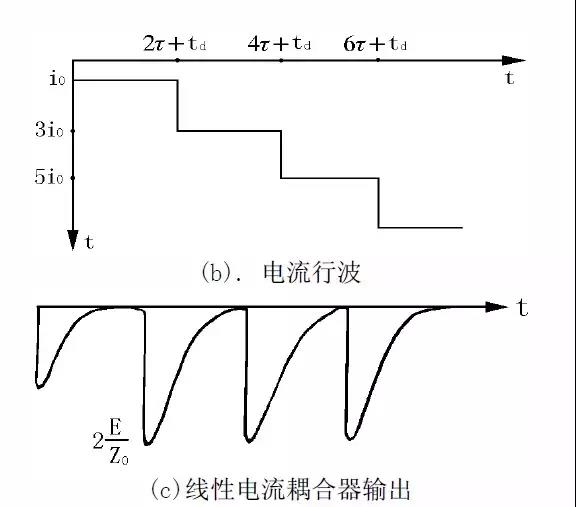 假設(shè)在t=0,電容上電壓為-E時(shí),球間隙擊穿,產(chǎn)生沿電纜向前運(yùn)動(dòng)的電流波i0=-E/Z0,電流波在電纜遠(yuǎn)端產(chǎn)生負(fù)的反射波ρi0=-i0,返回測(cè)量端,遠(yuǎn)端反射電流波在測(cè)量端產(chǎn)生正的全反射,運(yùn)動(dòng)到遠(yuǎn)端后,又被倒相反射回來??,電流波將如此來回反射,直到能量全部消耗掉。把測(cè)量端所有電流行波相加后,可得到如圖7.b所示的電流波形,圖7.c對(duì)應(yīng)的是電流取樣耦合器輸出??梢姡收宵c(diǎn)未擊穿時(shí),脈沖電流波形是交替變化極性的脈沖,相鄰脈沖之間的距離對(duì)應(yīng)電纜長(zhǎng)度。