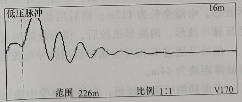 用GDBN-2000的低壓脈沖法,通過(guò)A相對(duì)金屬護(hù)層測(cè)試,得圖4-2 所示波形,通過(guò)B、C相對(duì)金屬護(hù)層測(cè)試,波形完全一樣,分析后認(rèn)為電纜在16m處開(kāi)路。再重新用萬(wàn)用表測(cè)試電纜的連續(xù)性,確認(rèn)電纜確實(shí)斷線了。