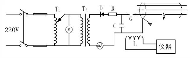 直閃法接線如圖5所示,T1為調(diào)壓器、T2為高壓試驗(yàn)變壓器,容量在1~5千伏安之間,輸出電壓在10~50千伏之間;C為儲(chǔ)能電容器;L為線電流取樣耦合器。電流取樣耦合器L的輸出經(jīng)屏蔽電纜接測(cè)距儀器(閃測(cè)儀)的輸入端子。注意:一般感應(yīng)式電流取樣耦合器L的正面標(biāo)有放置方向,應(yīng)將電流耦合器按標(biāo)示的方向放置,否則,輸出的波形極性會(huì)不正確。