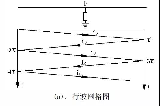下面分析一下電流波形的產(chǎn)生過程。首先說明,球間隙放電后,即被電弧短路,儲(chǔ)能電容相當(dāng)于直流電源,對(duì)高頻行波信號(hào)呈短路狀態(tài),電流波反射系數(shù)ρ=+1;而電纜遠(yuǎn)端開路,電流波反射系數(shù)ρ=-1。