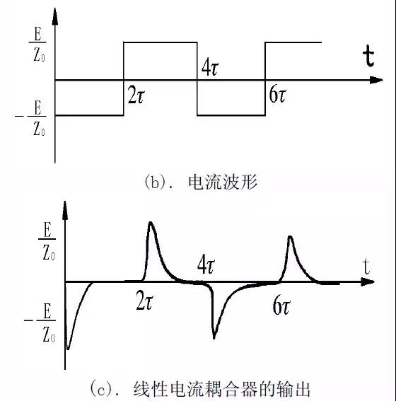 假設(shè)在t=0,電容上電壓為-E時(shí),球間隙擊穿,產(chǎn)生沿電纜向前運(yùn)動(dòng)的電流波i0=-E/Z0,電流波在電纜遠(yuǎn)端產(chǎn)生負(fù)的反射波ρi0=-i0,返回測(cè)量端,遠(yuǎn)端反射電流波在測(cè)量端產(chǎn)生正的全反射,運(yùn)動(dòng)到遠(yuǎn)端后,又被倒相反射回來??,電流波將如此來回反射,直到能量全部消耗掉。把測(cè)量端所有電流行波相加后,可得到如圖7.b所示的電流波形,圖7.c對(duì)應(yīng)的是電流取樣耦合器輸出??梢姡收宵c(diǎn)未擊穿時(shí),脈沖電流波形是交替變化極性的脈沖,相鄰脈沖之間的距離對(duì)應(yīng)電纜長(zhǎng)度。